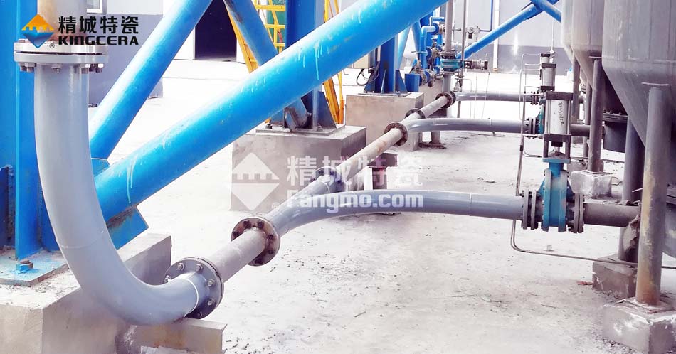 將精城牌氧化鋁耐磨陶瓷片用強力黏著劑將其按照一定的要求黏貼在比較熱的,并且相對比較彎的鋼管內壁上面。在常溫狀態下可以將其固化,從而形成一層比較牢固的防摩擦的內壁。每一圈的陶瓷都是使用特定的方式相互之間錯位開來,可以防止介質流到直線的縫隙里,避免因為漿液不斷的沖刷,這些直線的縫隙導致陶瓷脫落的情況發生。此管道內外均為整體結構,整體性能得到很大提升。