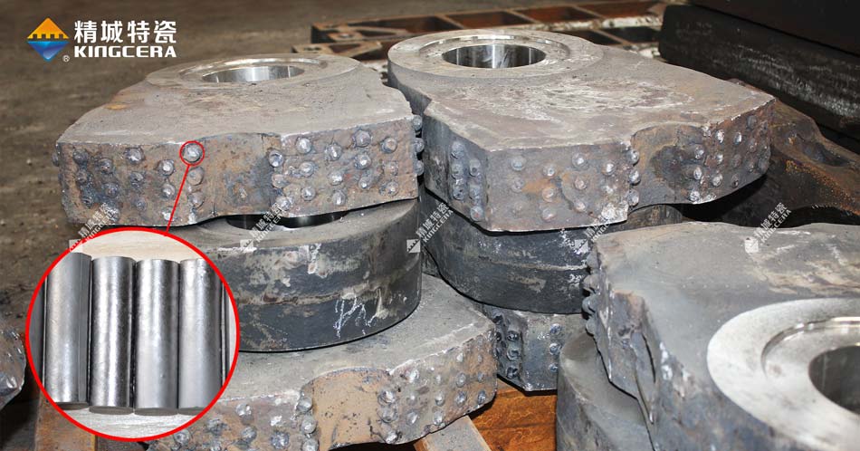 碳化鈦基金屬陶瓷棒是以碳化鈦(TiC) 為硬質(zhì)相,高錳鋼及其他金屬粉末為粘結(jié)相,再適當(dāng)配入相應(yīng)的合金元素,用粉末冶金方法生產(chǎn)的一種硬質(zhì)合金材料,可廣泛應(yīng)用于礦山,水泥、制砂等各種沖擊工況行業(yè)等,其中牌號(hào)TM52被廣泛應(yīng)用在破碎機(jī)耐磨件上,采用熔融的高錳鋼液澆鑄,將合金棒鑲鑄在耐磨件的工作面,二者產(chǎn)生牢固的冶金結(jié)合,制備成復(fù)合耐磨件,有效減少了基體材料高錳鋼的磨損,維修量和更換量顯著減少,從而降低了備件費(fèi)用,提高了破碎比和出料率。