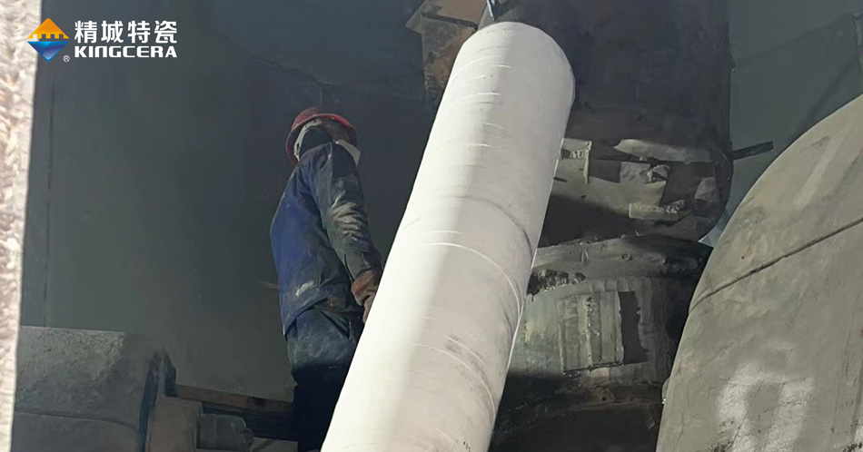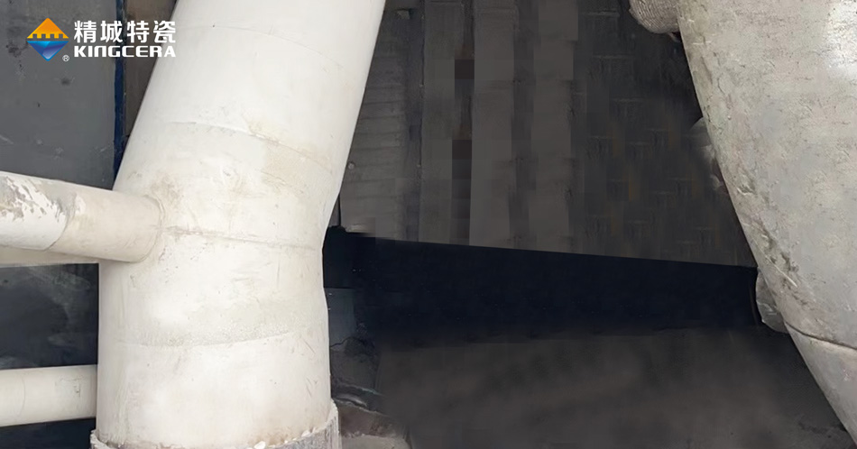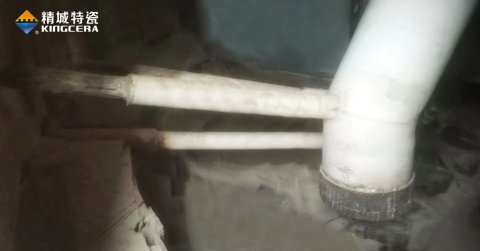 以回料管為例,生料立磨研磨的物料以礦石為主,大小不一、水分含量不同、硬度差異大、結(jié)構(gòu)復(fù)雜,而且還伴隨230℃左右的高溫,磨損情況復(fù)雜。而立磨回料管經(jīng)常需要輸送選粉機(jī)回落下來(lái)的礦石,棱角鋒利,加上太行山地區(qū)礦石硬度高,含鐵量較大,管道內(nèi)壁承受切削磨損,回料管外壁還要承受風(fēng)蝕磨損和強(qiáng)沖擊,同樣伴隨高溫。雙重磨損之下,回料管很容易被磨穿,針對(duì)這種復(fù)雜情況,精城現(xiàn)場(chǎng)技術(shù)支持工程師當(dāng)場(chǎng)給出了具體解決方案,不同磨損采用不同的陶瓷工藝,在盡可能節(jié)省成本的同時(shí)為客戶解決了磨損難題。